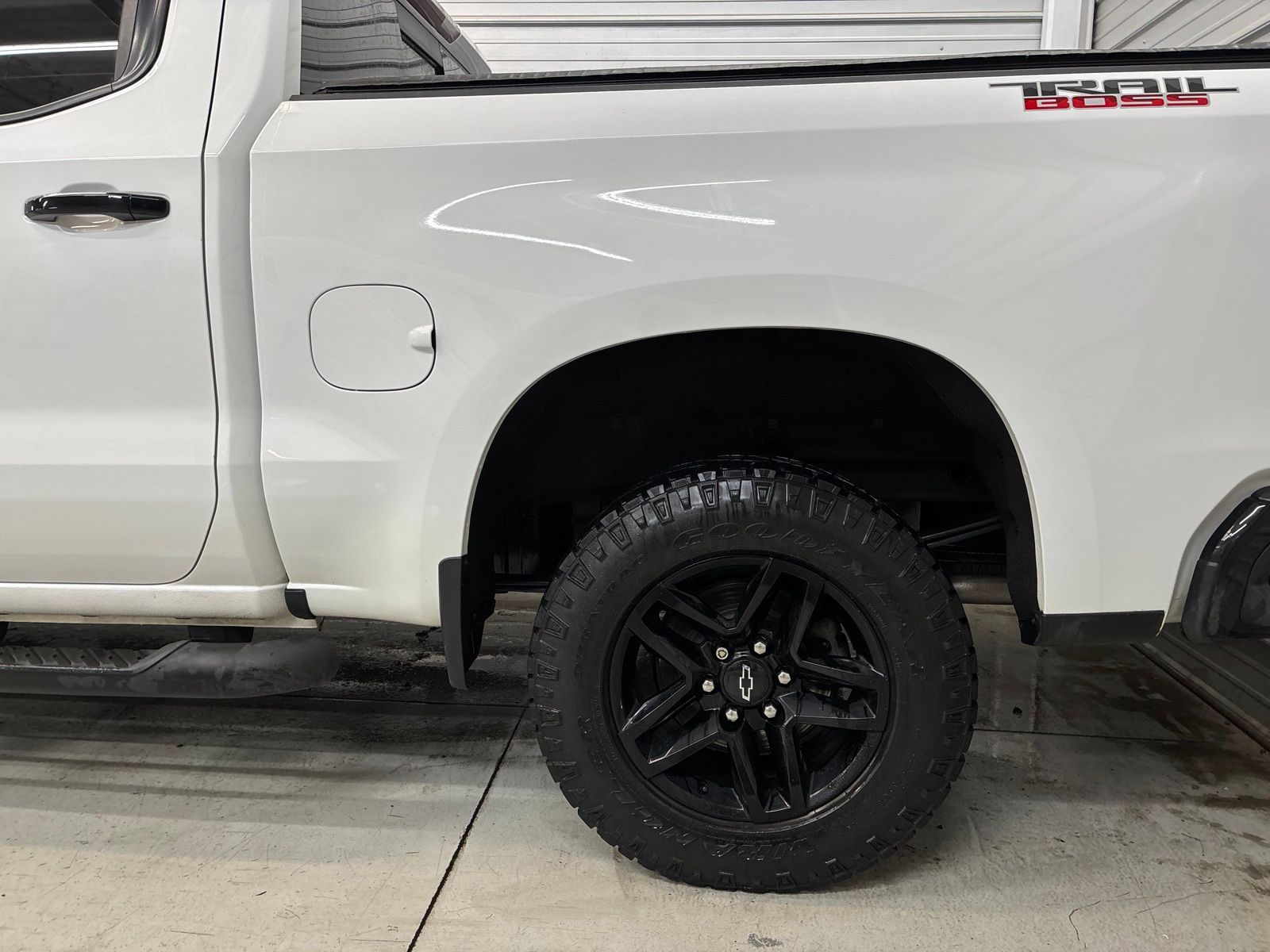 The exterior of this Silverado is finished in a striking White color, complemented by the bold and rugged styling that defines the Trail Boss trim. The high-gloss black grille, mirror caps, and 18-inch black painted aluminum wheels give this truck a unique and aggressive appearance that is sure to turn heads.